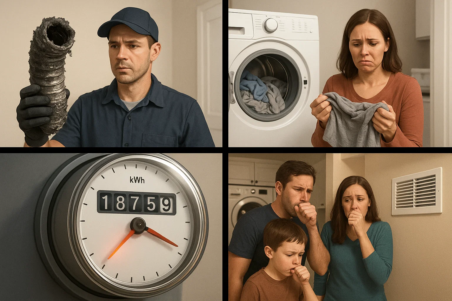 Four-panel image showing dangers of neglected dryer vents including fire, inefficiency, energy waste, and bad air quality